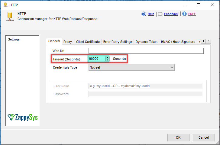 If you experience a connection timeout, it is advisable to adjust the ZappySys HTTP connection settings to mitigate the issue. Specifically, navigate to the General tab under the HTTP connection, and increase the timeout duration. By doing so, you allow the system more time to establish and complete the connection, enhancing the reliability and effectiveness of the ZappySys HTTP connection.
