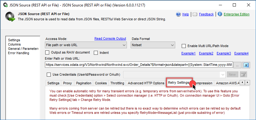 We can enable automatic retries for transient errors, such as server- or network-related issues, in ZappySys. This can enhance the system’s ability to recover from temporary glitches and maintain a more robust and reliable connection.