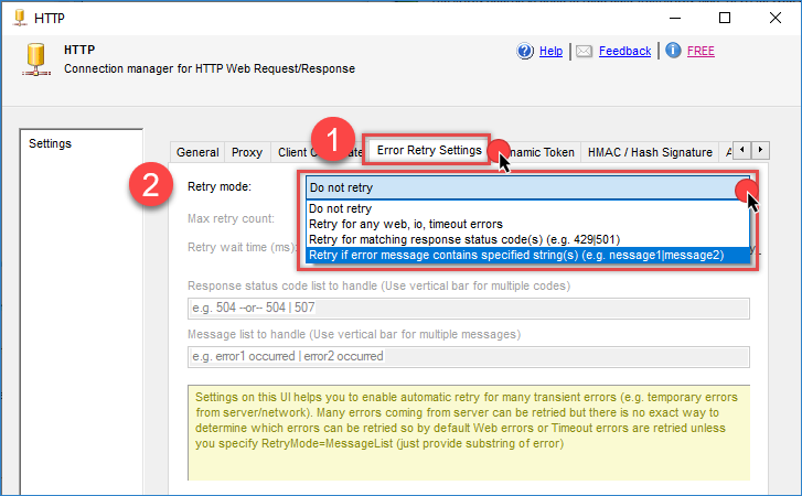 Within ZappySys OAuth/HTTP Connection in the ‘Error Retry Settings’ tab, we can configure options for automatic retries in the event of errors. This includes the ability to customize settings for transient errors, like those arising from temporary server or network issues. Adjusting these parameters enhances the connection’s ability to automatically recover and ensures a more reliable integration.