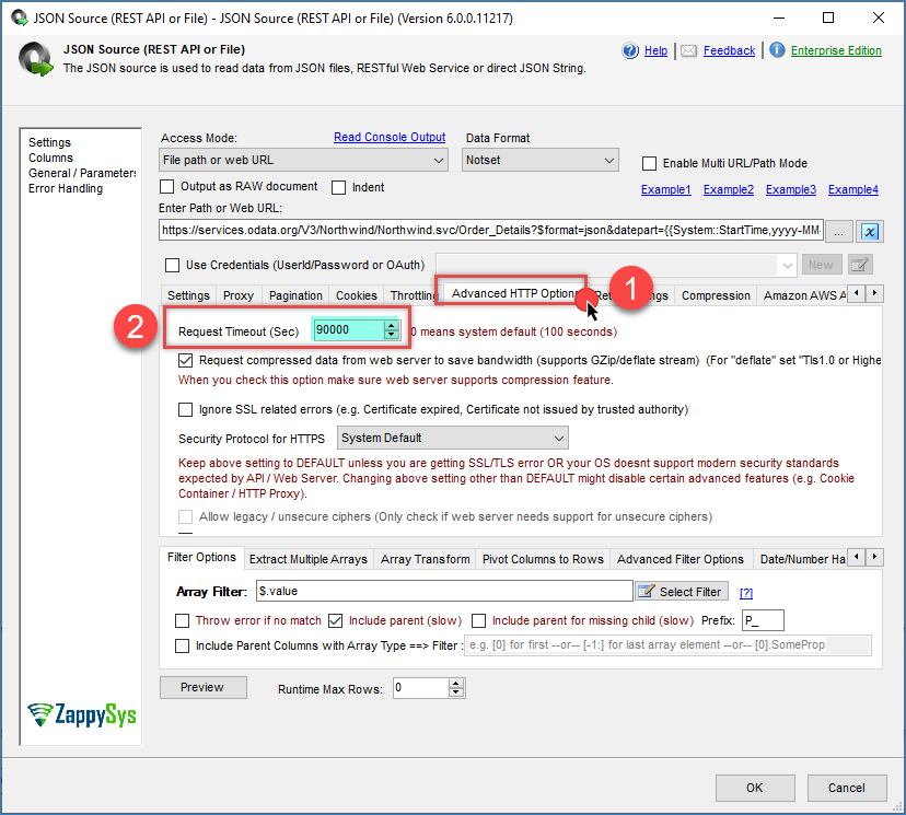 To effectively manage timeout errors in the ZappySys JSON/XML Component, consider fine-tuning the Timeout setting based on your specific needs. For instance, increasing the value to 90000 milliseconds can potentially mitigate timeout-related issues, providing a more robust and responsive system during data processing.Additionally, ensure that other relevant settings in the ZappySys Component are appropriately configured to optimize performance and prevent timeouts during data processing.