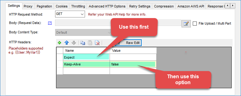 For long-running API requests, you may also disable HTTP connection reuse to improve stability. To do this, add the following headers in the Headers Grid :ExpectandKeep-Alive: false