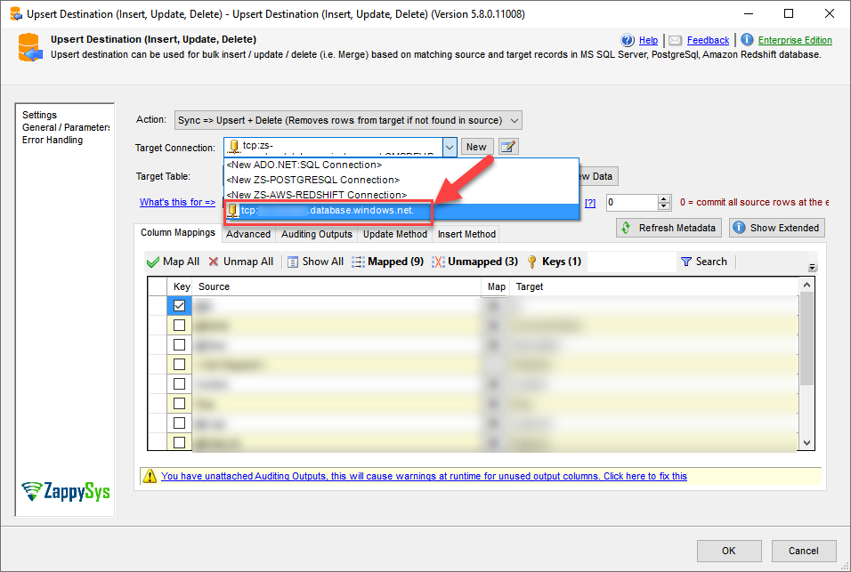 When using the ZappySys SSIS Upsert Destination component, you may encounter a situation where the Azure SQL Server / MS SQL Server (ADO.NET) Connection is not visible in the connection drop-down list. This typically happens when the connection is not configured properly or was created using an unsupported provider type.