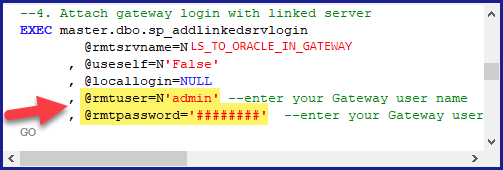 In the generated script scroll down to 4. Attach Gateway login with linked server step, enter your Data Gateway admin username and password.