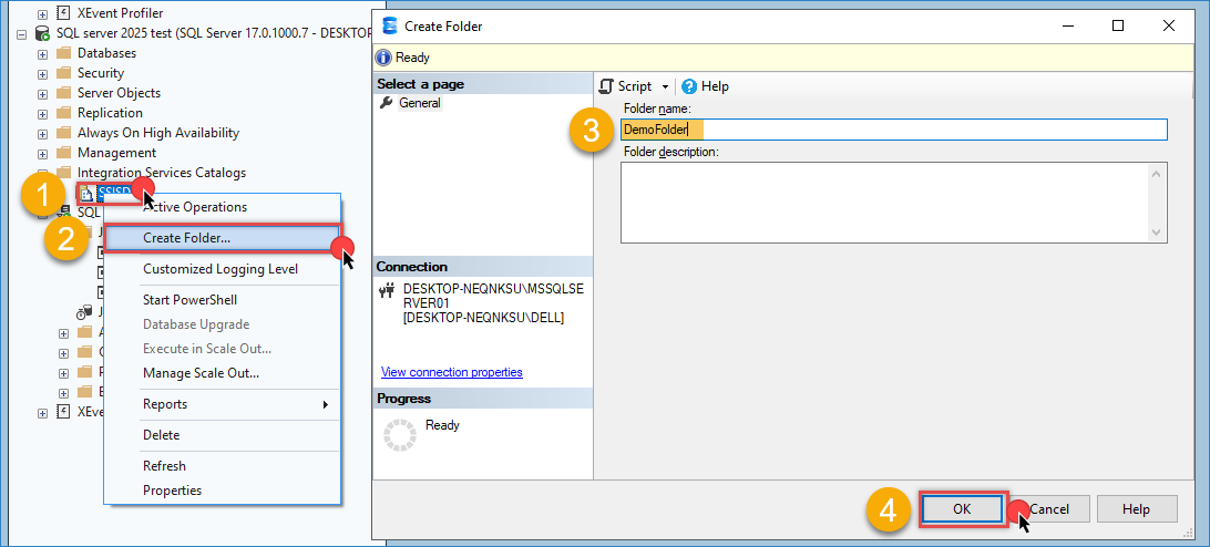 Expand Integration Services Catalogs, right-click SSISDB, and select Create Folder. Enter a folder name and click OK.