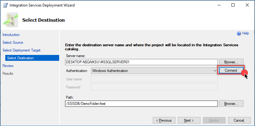 .ispacfile generated from your SSIS project, click Next, and choose SSIS in SQL Server.