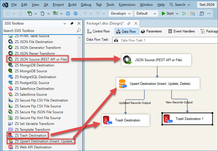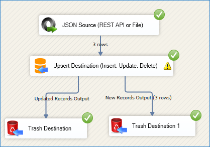 Create an SSIS package. In this example, the package includes a JSON source, an Upsert destination, and a Trash destination.