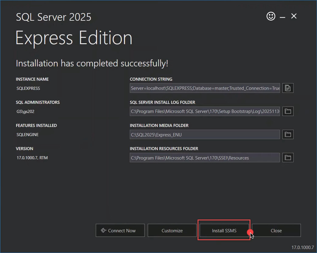 After the installation completes, copy the connection information and click Install SSMS to download the SQL Server Management Studio 22 installer.