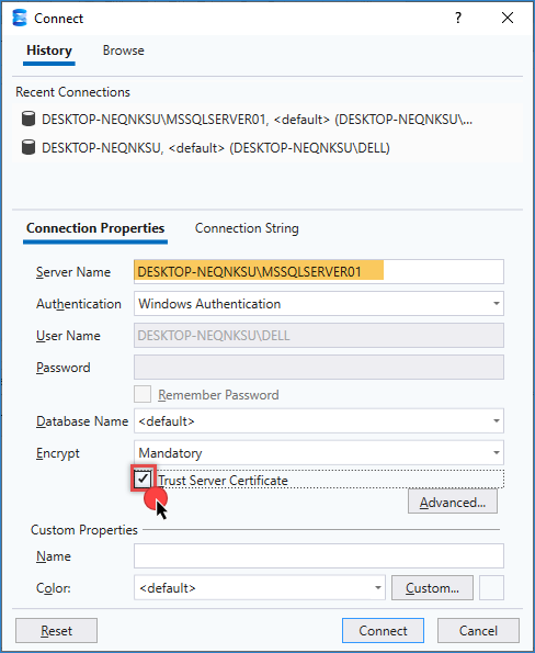 Enter the server name, click Connect, verify the target path created in the previous step, and click Next.