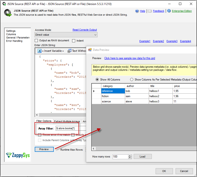Filtering data in JSON format is a common requirement when working with APIs and structured data sources in SQL Server Integration Services (SSIS). The ZappySys JSON Source component allows you to efficiently fetch, parse, and filter JSON data. This article will guide you through the process of filtering JSON data using JSONPath expressions in SSIS.