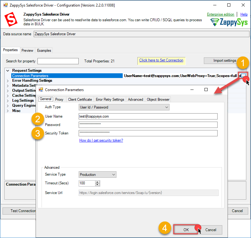 In the connection settings, enter your Salesforce username, password, and security token, then click Test Connection to validate access.