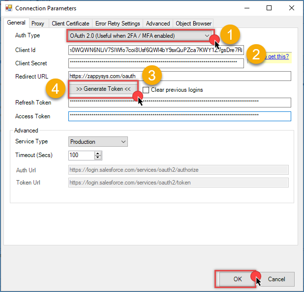 As an alternative, you can use OAuth authentication by entering your Client Id, Client Secret, and Redirect URL, then clicking Generate Token.