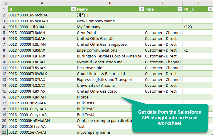 The Salesforce data is now available in an Excel worksheet and can be refreshed at any time.
