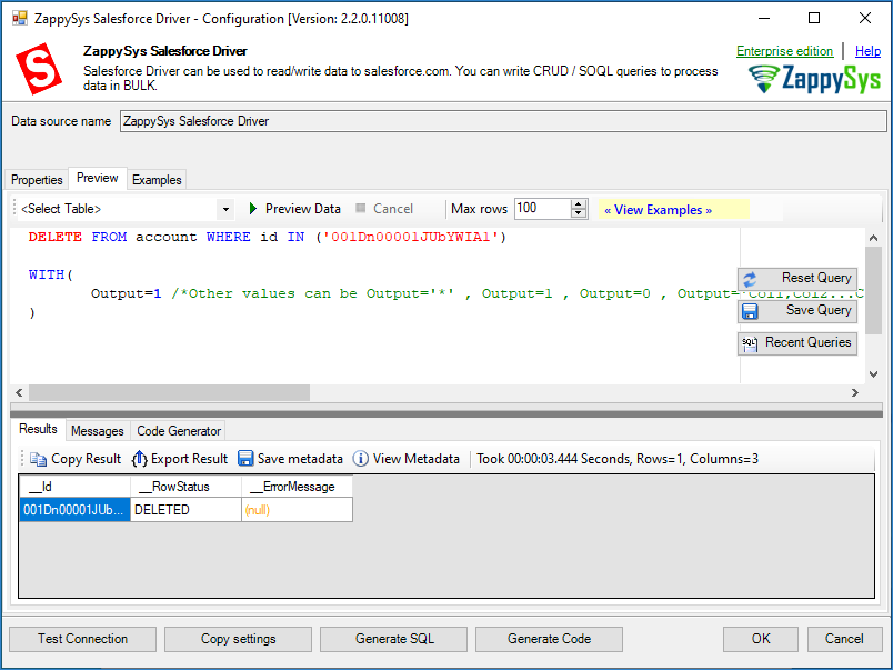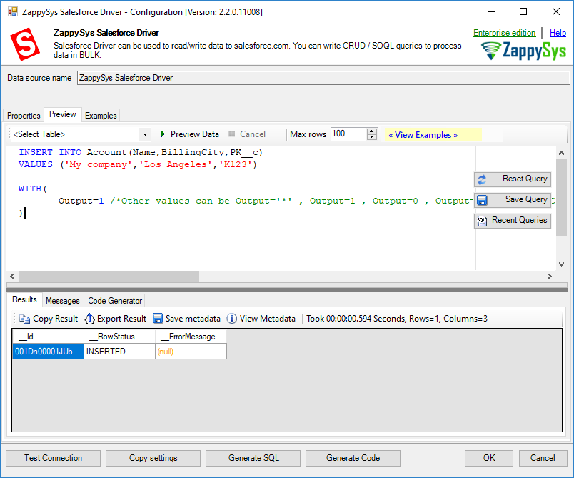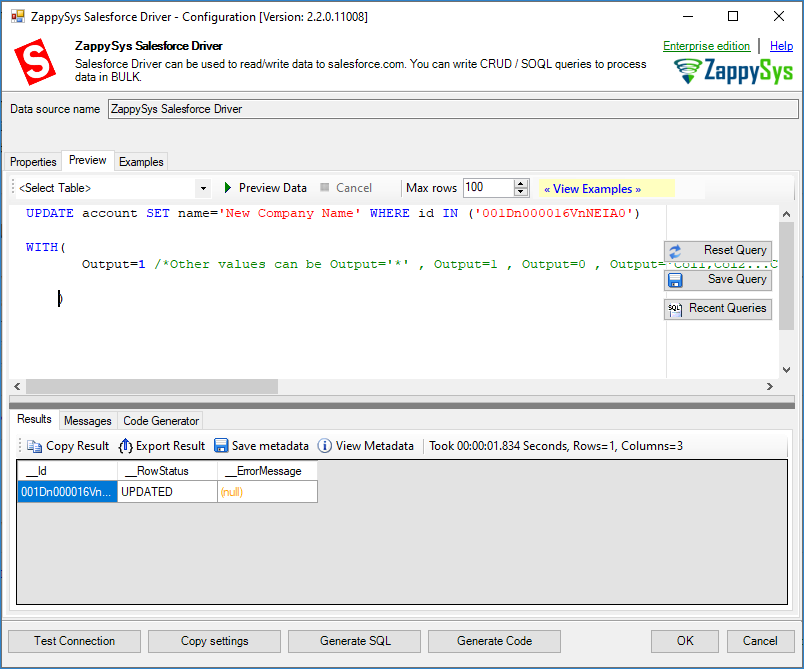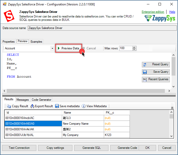 Go to the Preview tab, select any Salesforce object, and click Preview Data to confirm the connection is working correctly.