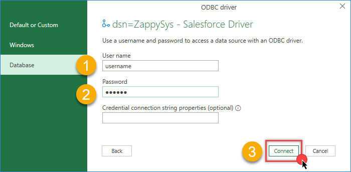 When prompted, enter your Salesforce credentials if required. The ODBC driver handles authentication.