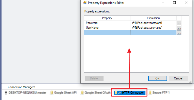 For connections requiring authentication, such as HTTP Connection, use expressions to assign the Username and Password parameters dynamically. For more details, see this article on SSIS Expressions.