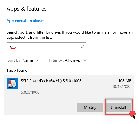 Locate SSIS PowerPack in the list, then click Uninstall.