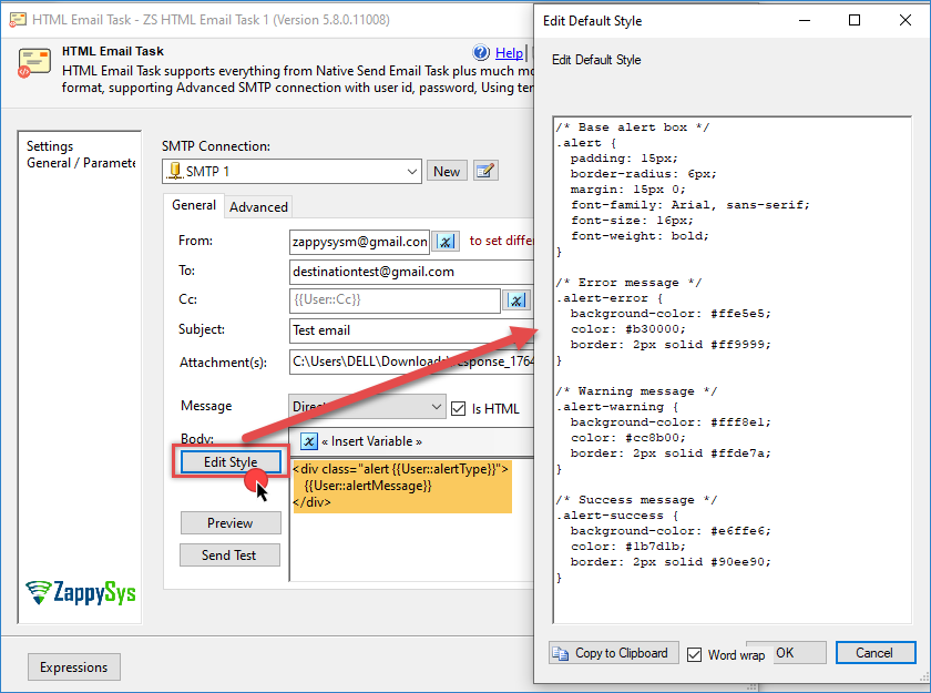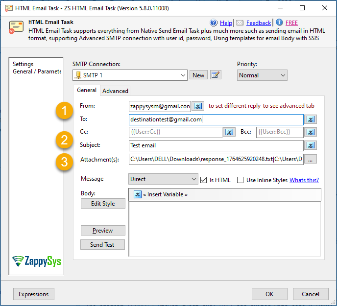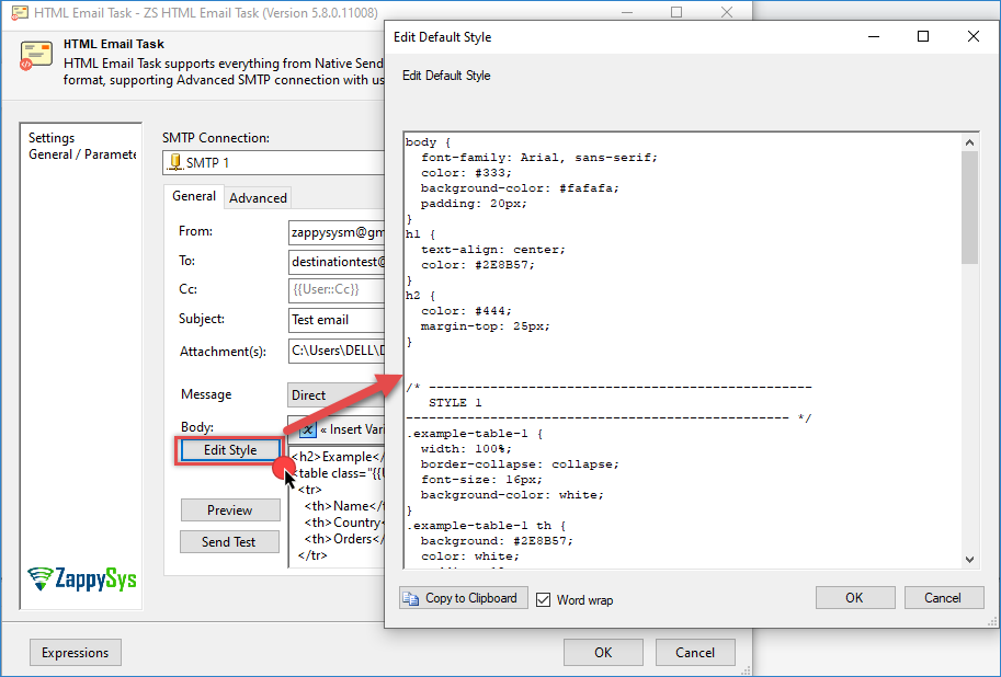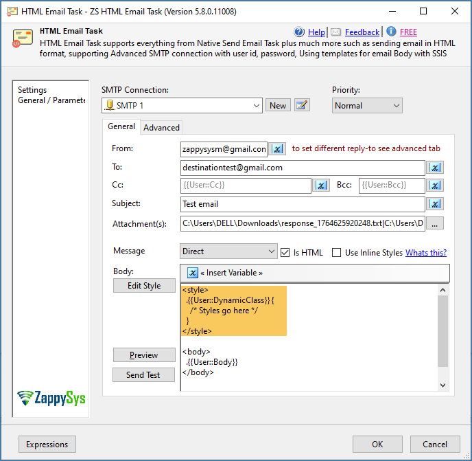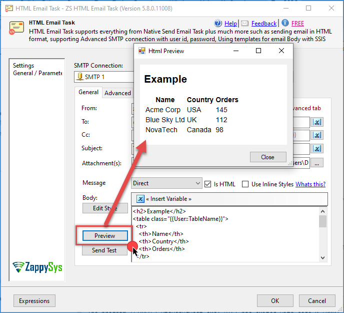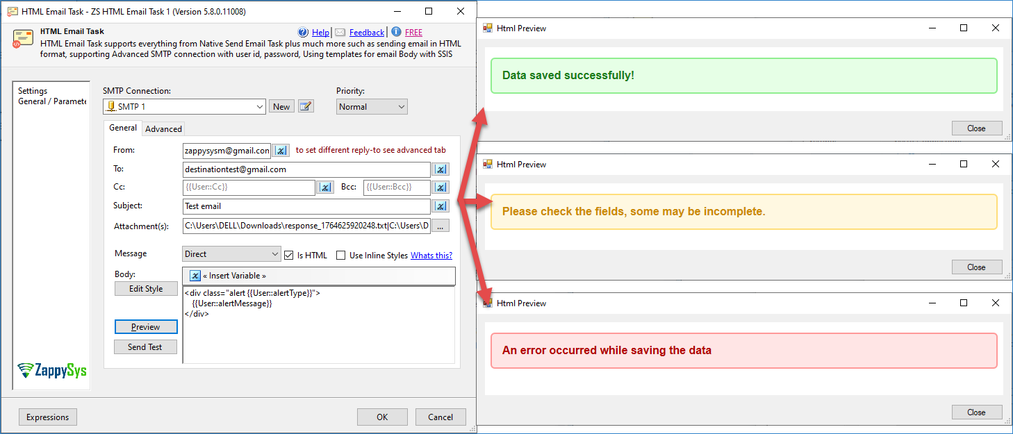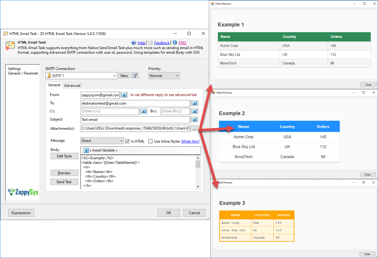 The ZS HTML Email Task from ZappySys SSIS PowerPack enables you to create and send custom HTML emails directly from SSIS. By incorporating CSS styles, tables, and dynamic variables, you can automatically deliver highly formatted, professional reports.