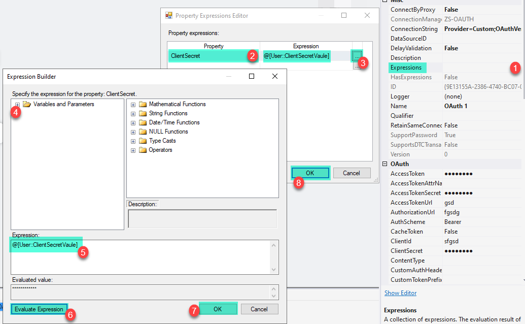 As saved in Step 6 (Parse secret and store in SSIS variable), in the Property Expressions Editor, configure the expression as follows: