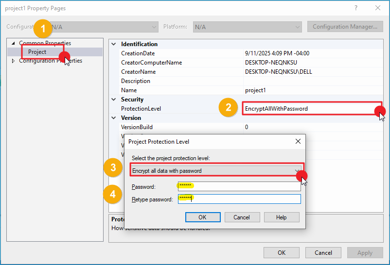 - In the Project section, under Security, set ProtectionLevel to the desired option (e.g.,