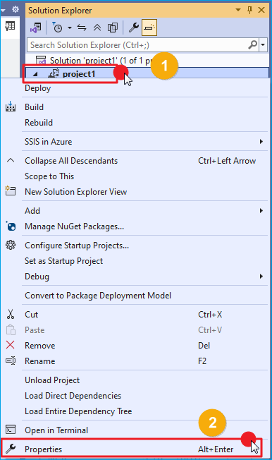 - Locate the SSIS project in Solution Explorer or Object Explorer.