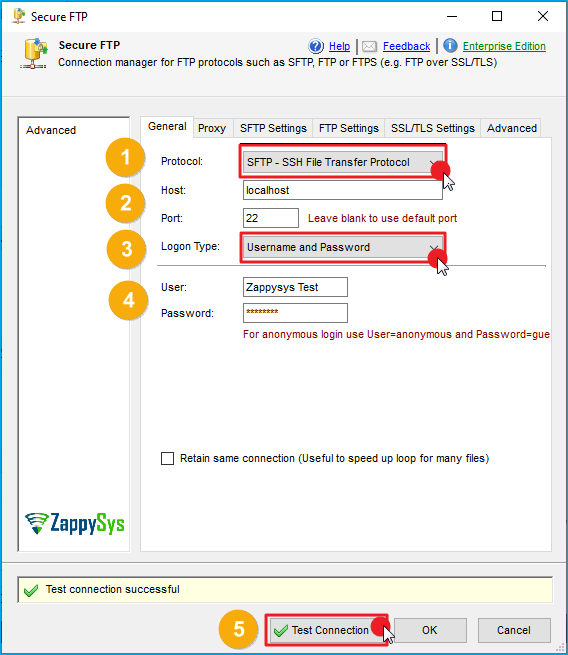 - Enter the server’s host, port, username, and password. Mark the password as sensitive to ensure SSIS encrypts it according to the package ProtectionLevel.
