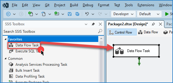 Drag and drop a Data Flow Task from the SSIS Toolbox onto the Control Flow surface and double-click it.