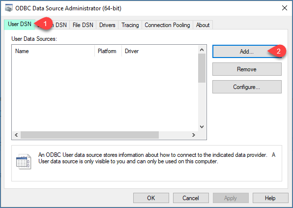 Open ODBC Data Sources by typing “ODBC” in the Windows search box and launching ODBC Data Sources (64-bit).
