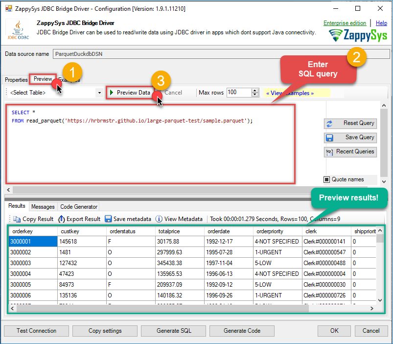 Go to the Preview tab and run a sample query to confirm access to the Parquet file. For more SQL examples, see the JDBC Bridge documentation.