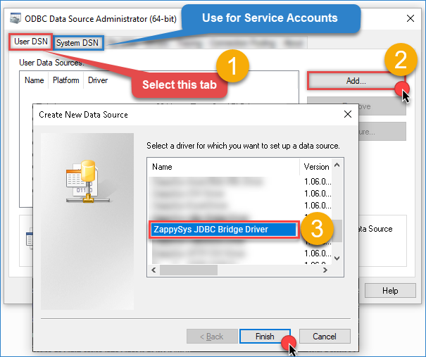 To allow access for SSIS, go to System DSN (recommended for SQL Server Integration Services) and click Add.