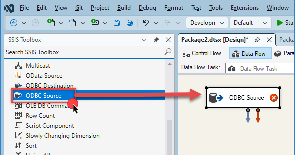 Inside the Data Flow, drag and drop an ODBC Source component.