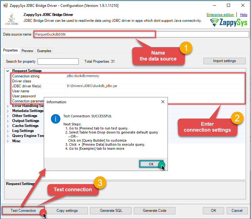 Enter the connection settings and configure the required parameters.