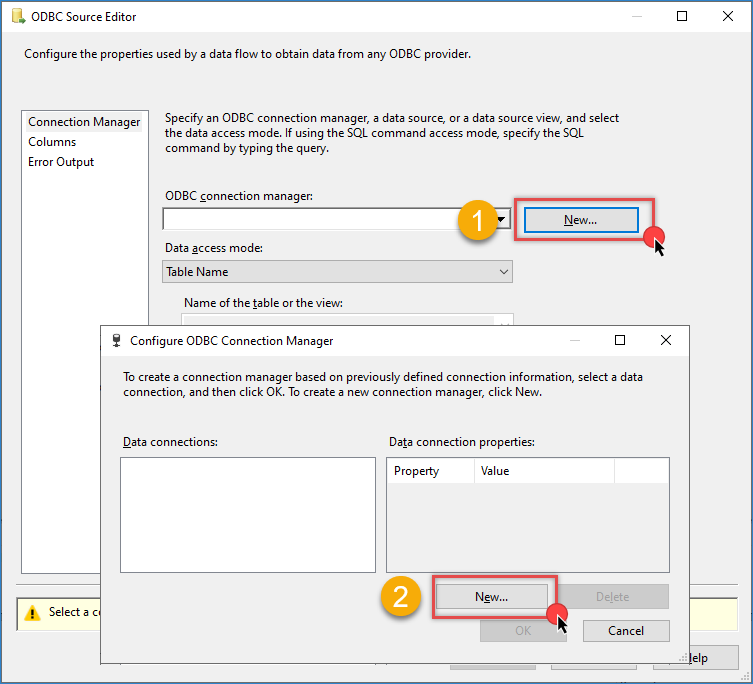 Click New to open the Configure ODBC Connection Manager window, then click New again to create a new ODBC connection.